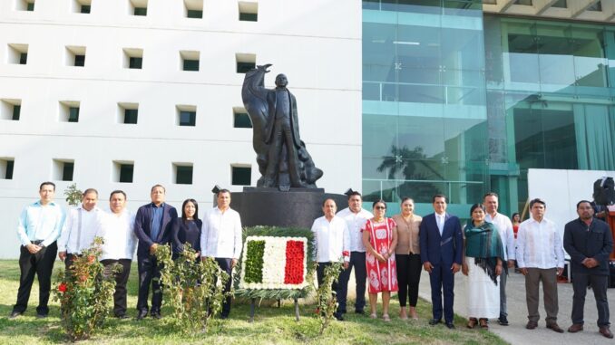 “Don Benito Juárez García, el indígena zapoteca que con voluntad firme perseveró, luchó, logró vencer la adversidad y forjar su destino. Un destino que sin duda alguna ha dejado huella en la construcción de nuestra nación colocando las bases de un México moderno”, refirió.