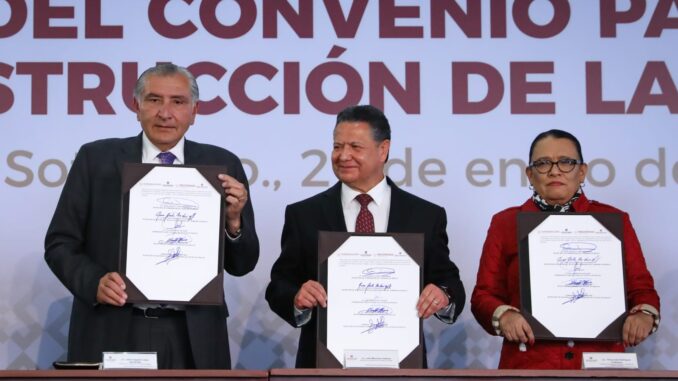 Los secretarios de Gobernación, Adán Augusto López Hernández, de Seguridad y Protección Ciudadana, Rosa Icela Rodríguez Velázquez y el gobernador del estado de Hidalgo, Julio Menchaca Salazar, encabezaron la Firma de Convenio para la Construcción de la Paz, el cual, tiene el objetivo de fortalecer el trabajo coordinado de los tres órdenes de gobierno para enfrentar el flagelo de la violencia.