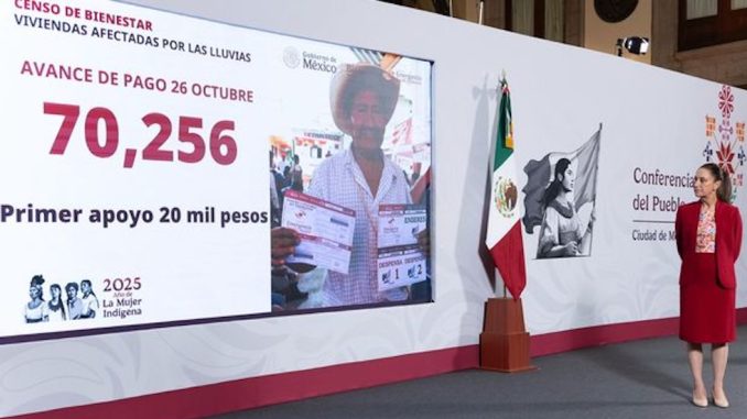 El Gobierno de México, a través de la Secretaría de Bienestar, informó que, al 26 de octubre, 70 mil 256 personas han recibido el primer apoyo de 20 mil pesos, así como dos vales de despensa y uno de enseres, por las afectaciones a causa de las lluvias extraordinarias registradas a comienzos de octubre en Veracruz, Hidalgo, Puebla, San Luis Potosí y Querétaro.