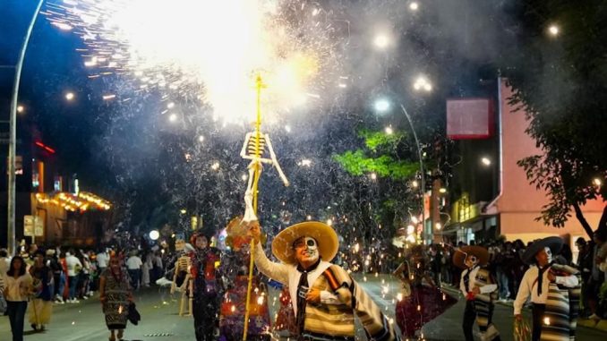Las calles palpitan, las risas estallan y los rostros pintados se confunden entre catrinas, catrines, esqueletos y disfraces de papel, plumas, luces, listones y textiles.