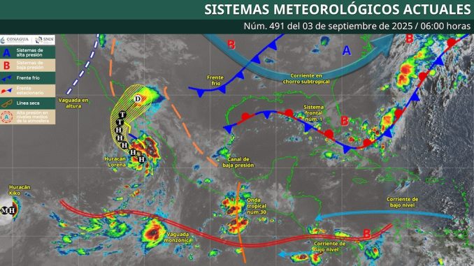 Este día, la circulación y desprendimientos nubosos del huracán Lorena, en combinación con el monzón mexicano y una vaguada en altura, ocasionarán lluvias muy fuertes a puntuales intensas acompañadas con descargas eléctricas en el noroeste y occidente del país; además de rachas de viento fuertes a intensas y oleaje elevado en el golfo de California y las costas de Baja California, Baja California Sur, Sonora, Sinaloa y Nayarit. A su vez, el sistema frontal núm. 1 se extenderá como estacionario sobre el noreste de México, generando rachas de viento de 40 a 60 km/h en dicha región, además de chubascos y lluvias fuertes en Coahuila, Nuevo León y Tamaulipas. Por otra parte, la onda tropical núm. 30 se desplazará sobre el sureste y sur del territorio nacional y en combinación con el ingreso de humedad del mar Caribe, propiciarán lluvias fuertes a muy fuertes en las regiones mencionadas, incluida la península de Yucatán. Un canal de baja presión en la Mesa Central, inestabilidad atmosférica y el ingreso de humedad del océano Pacífico y golfo de México, originarán lluvias fuertes a muy fuertes en el centro y oriente del territorio mexicano. Finalmente, continuará el ambiente caluroso a muy caluroso en zonas del norte de la República Mexicana, litoral del Pacífico y del golfo de México, además de la península de Yucatán, con temperaturas que podrían superar los 40 °C en Baja California, Baja California Sur y Sonora.