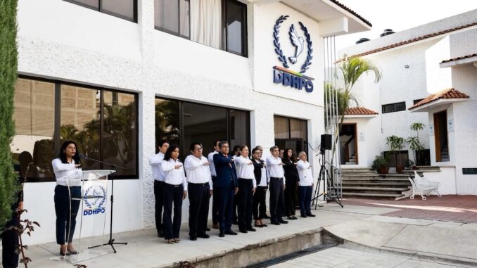 Por primera vez en su historia, bajo los acordes de la Banda de Guerra de la Coordinación Estatal de la Guardia Nacional en el Estado de Oaxaca y la Bandera con Escolta del Sexto Regimiento de Artillería, así como en compañía de alumnas, alumnos y del Director de la Secundaria Técnica No. 6, Profesor Santos Silva Ponce, la #DDHPO, representada por la Mtra. Elizabeth Lara Rodríguez, conmemoró con un acto solemne el Día de la Bandera de México, celebrando no solo el símbolo que representa nuestra unidad y orgullo como nación, sino también los principios fundamentales que nuestra bandera evoca como son libertad, justicia y dignidad.