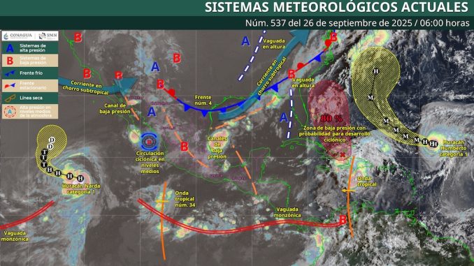 Para hoy, el monzón mexicano y una circulación ciclónica en niveles medios de la atmósfera, sobre el sur del golfo de California, así como la corriente en chorro subtropical, propiciarán lluvias puntuales intensas en Sinaloa; puntuales muy fuertes en Baja California Sur, Nayarit, Durango, Chihuahua y Sonora; y lluvias aisladas en zonas de Baja California. Por otra parte, el sistema frontal núm. 4 prevalecerá sobre los estados fronterizos del noreste del país y en combinación con un canal de baja presión sobre el oriente del territorio nacional, ocasionarán lluvias puntuales intensas en Veracruz y Puebla; y puntuales fuertes en Tamaulipas, Nuevo León y Coahuila. Simultáneamente, canales de baja presión sobre el interior de la República Mexicana e inestabilidad atmosférica, ocasionarán lluvias puntuales intensas en Oaxaca; puntuales muy fuertes en Guerrero, Morelos, Estado de México, Michoacán, Colima, Jalisco, Guanajuato y San Luis Potosí; y puntuales fuertes en Tlaxcala, Ciudad de México, Hidalgo, Querétaro, Aguascalientes y Zacatecas. A su vez, un canal de baja presión sobre el sureste mexicano y el ingreso de aire húmedo del golfo de México y mar Caribe, mantendrán la probabilidad de lluvias puntuales fuertes en Yucatán, Tabasco y Chiapas; y chubascos en Quintana Roo y Campeche. Por su parte, la onda tropical núm. 34 que se desplazará al sur de las costas de Jalisco, sin generar efectos en el territorio nacional, mientras que el huracán Narda, alejado de costas nacionales, mantendrá oleaje elevado en la costa occidental de Baja California Sur. Finalmente, continuará el ambiente cálido a caluroso por la tarde en la mayor parte del territorio nacional, con temperaturas máximas mayores a 35 °C en zonas de Baja California, Baja California Sur, Sonora, Sinaloa, Coahuila, Nuevo León, San Luis Potosí, Jalisco, Colima, Michoacán, Guerrero, Oaxaca, Chiapas, Tamaulipas, Tabasco, Veracruz, Campeche y Yucatán.